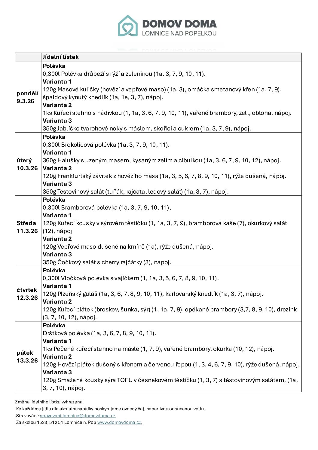 - Informace o výskytu konkrétních alergenů v pokrmech jsou uvedeny formou číselných kódů v jídelním lístku.